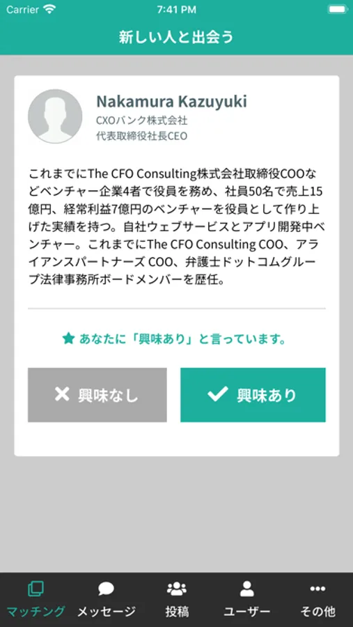 CXOバンクは、従来のマッチングアプリと違い、双方が「興味ある」にならずとも「あなたに興味のある人」とも繋がれるダイレクトネットワーキングサービスです。毎日チェックして良質なCXOと繋がりましょう。