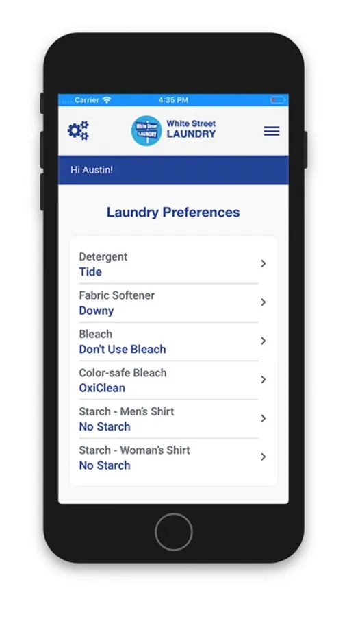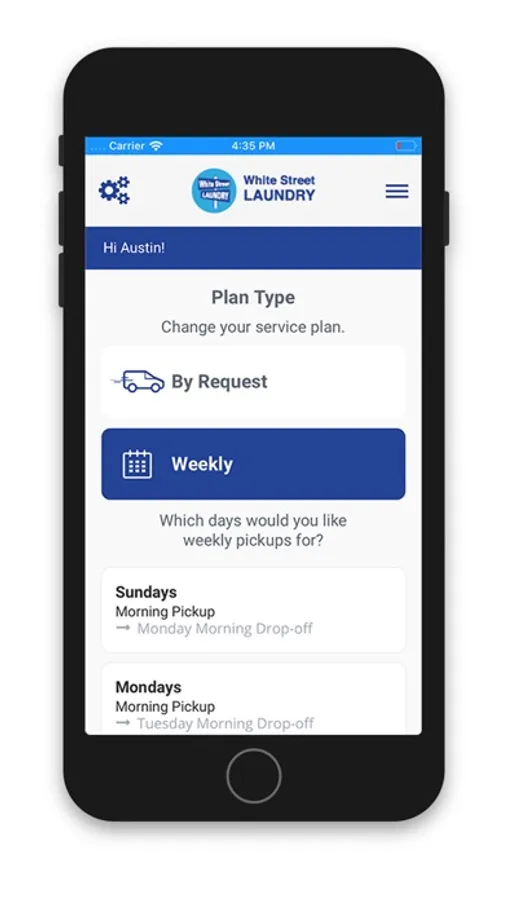 Choose your plan type – weekly or “by request,” detergents (familiar brands including eco-friendly, hypoallergenic and fragrance free), fabric softeners, wash temperatures, dryer preferences, dryer temperatures, folding preferences, and notifications types and frequency.