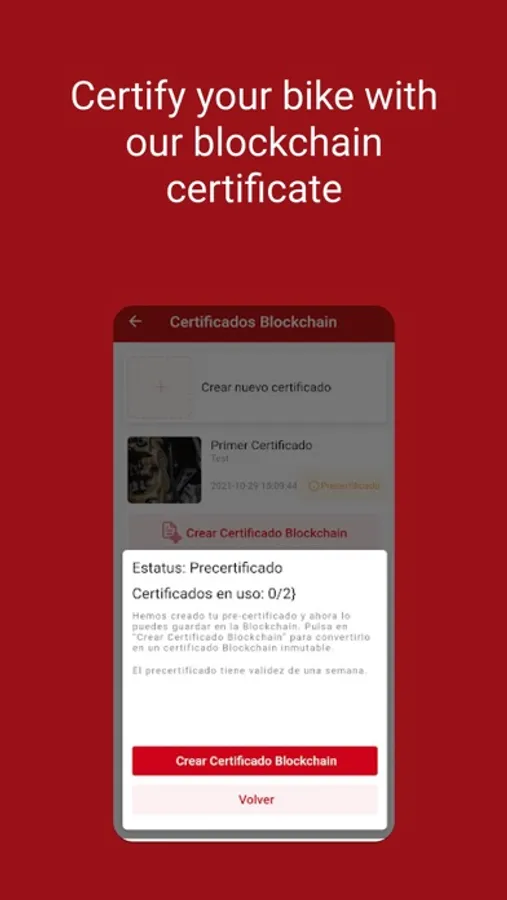 5. Guarda el PRE- CERTIFICADO en Blockchain y Crea la IDENTIDAD DIGITAL DE TU MOTO