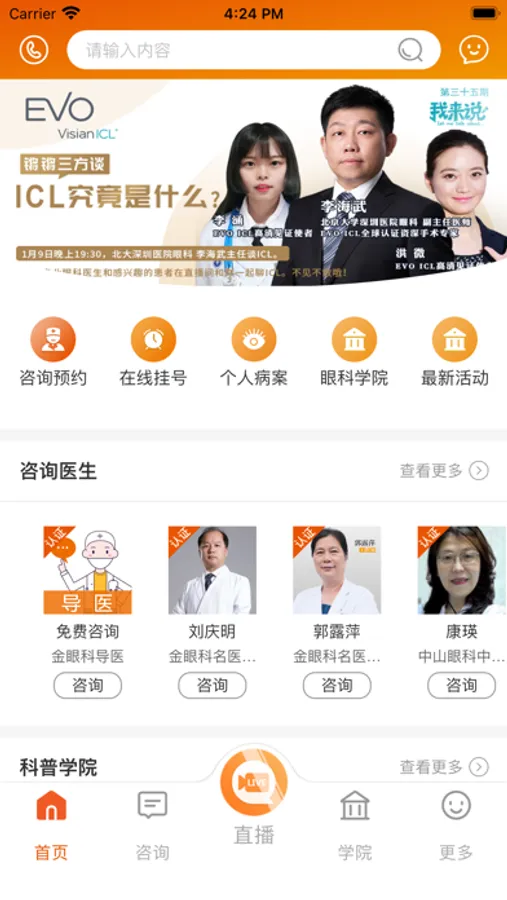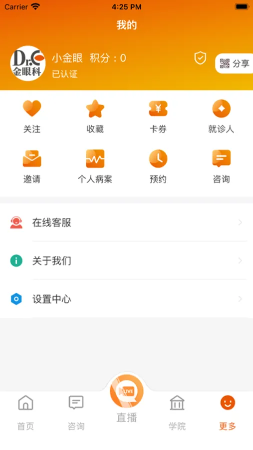 服务内容:在为您建立眼健康管理档案的基础上进行定期的眼部健康管理,从而提供RGP验配、近视全飞秒手术,老视手术、ICL晶体植入手术、高端屈光白内障手术等眼视光全程服务。让您看得见、看得清、看得舒服和看得持久、看得美丽是金眼科的终极目标。