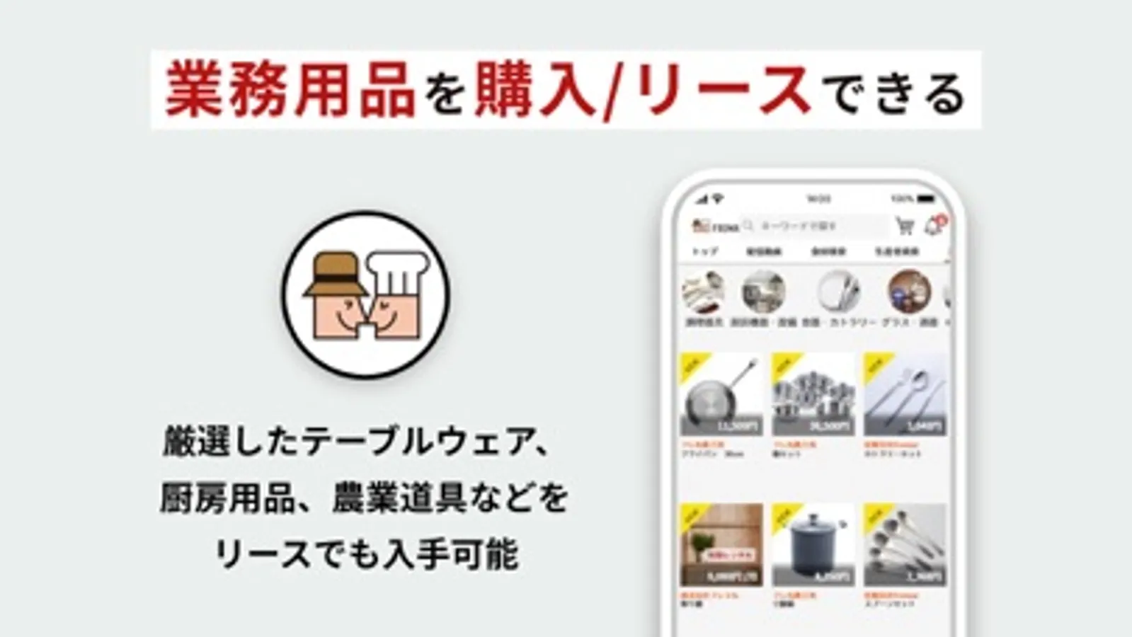 スマホでも、タブレットでも、パソコンでも好きな端末で食材仕入れや厨房用品・カトラリーなどの道具も購入・リースができます。