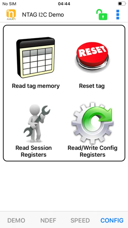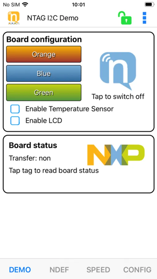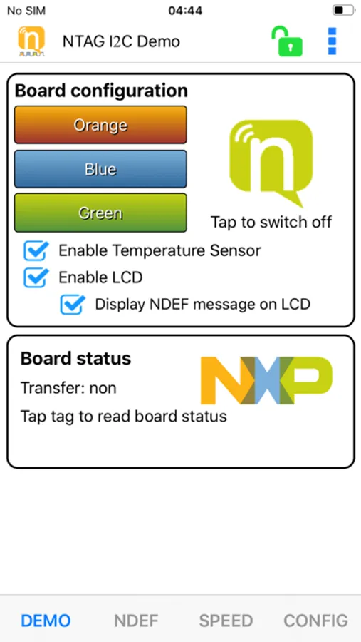 You can use it to change the LED color to light up on the NTAG I²C demonstration board, to measure the speed of download and upload with NTAG I²C based on your NFC device or to read & change the chip configuration.