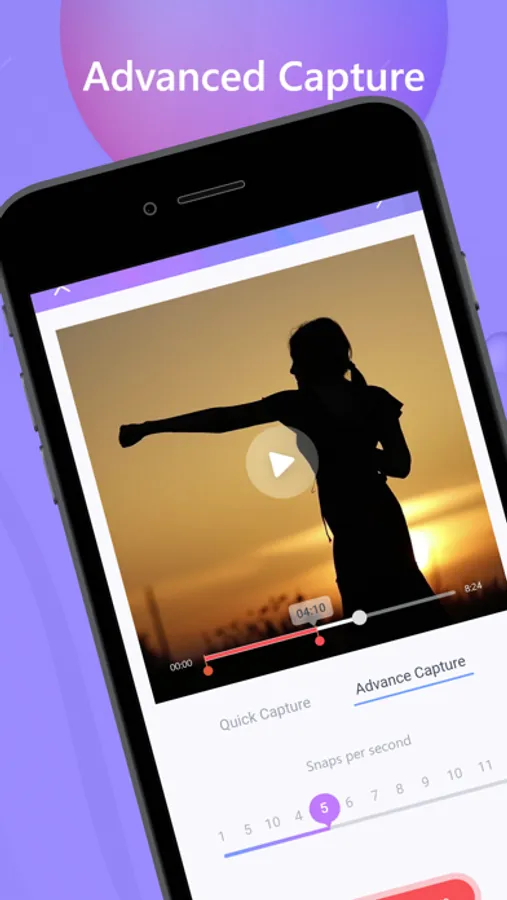 This is a more advanced function and will be helpful if you need to capture multiple frames from a video. It allows you to select how many frames you want to capture and what intervals you want to capture them. You can select a video and set a timer (for example, a frame capture at every 10 seconds). The app will automatically capture a frame at every 10 seconds of the video. All the pictures will then be added to a folder from which you can select what images you need to keep or delete.