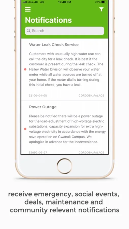 • Receive emergency, social events, deals, maintenance and other common interest community relevant notifications, as well as personal related ones such as invoices and fees posting and payments history