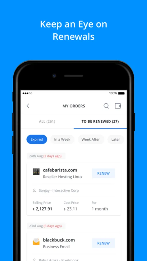 Don't let your Customers' websites go down - remind them of their renewals beforehand. With the app, renewing orders is a simple 2-step process. To ensure that you do not miss any renewals, you will also receive a notification at the start of the week.