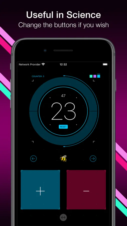 You want to count something without miscounting? With this futuristic app you can count up and down with just a click. A haptic feedback (provided device is required) and a sound makes your counting possible without eyes on the screen. If the counter is reset, the last sum remains visually saved. In addition, the plus and minus buttons can also be swapped if desired. The counter can also be changed quickly with a swipe gesture on the name of the counter.