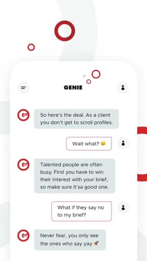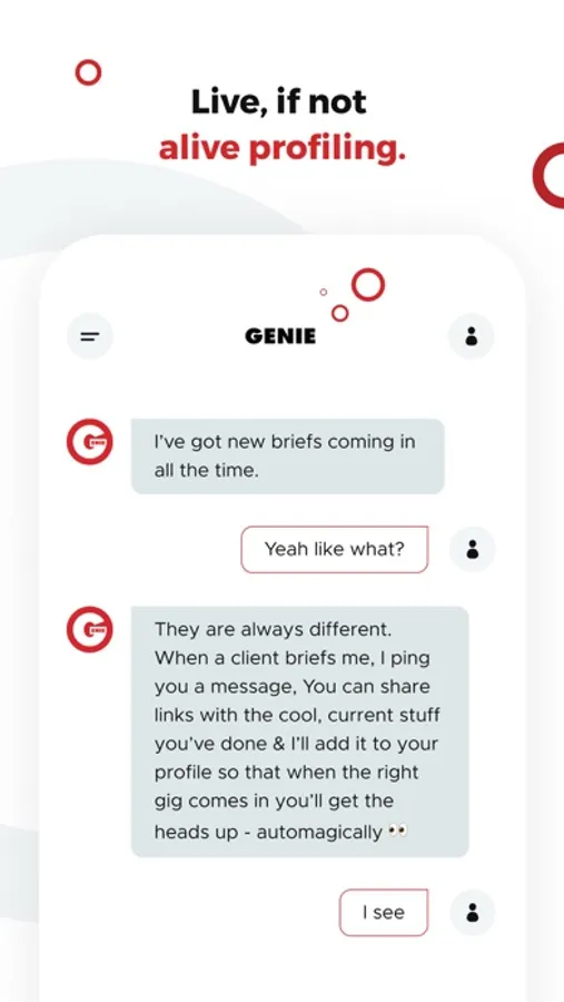 Just tell GENIE the sort of work you’ve done, what you’re into and she'll find you the best briefs. She'll send you notifications when new briefs come in, you can say yay or nay all within the app.
