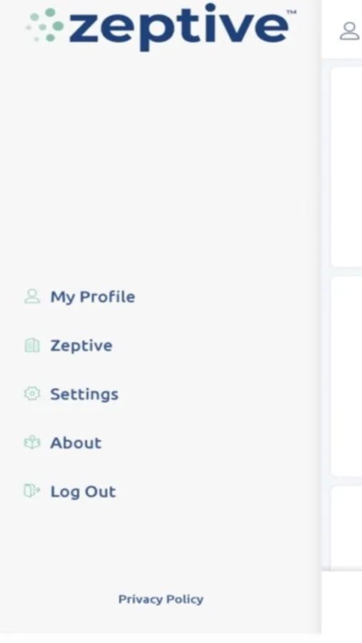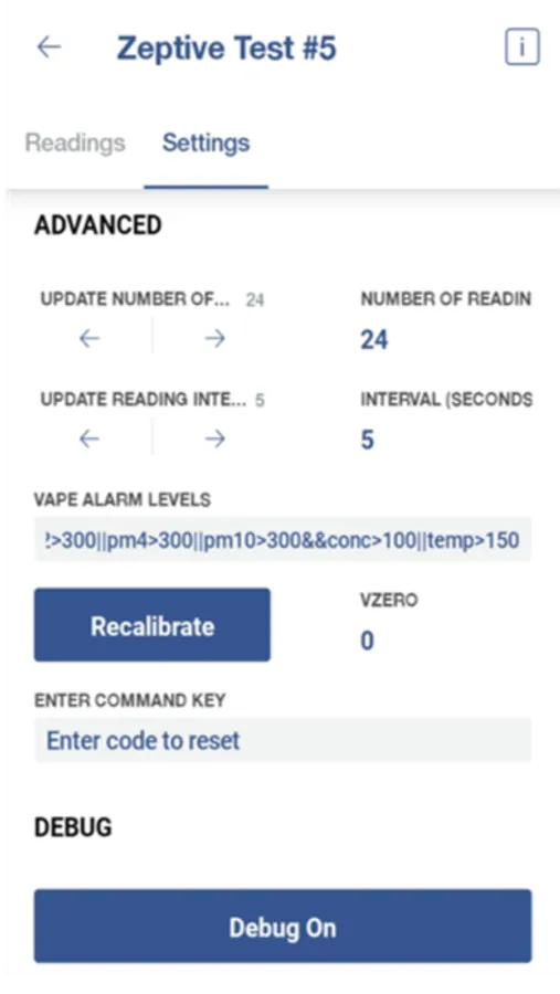 The Dashboard shows a summary view of the device status. The Readings page is an overview of the current data view and historical data view. The Settings page allows users to modify system parameters. The Dashboard and Readings pages updated as data changes on the sensors and get relayed to the Zeptive application. The Settings page changes how the device is configured.