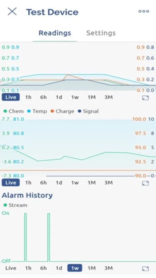 The Readings Page can be selected by clicking on the main dashboard tile for the sensor of interest. The Readings Page displays the data outputs from the sensors for a selected system. Users can also see quickly if there is an Alert or the system has No Alert. Gauges are used as a tool to show each sensor output while historical data can be viewed in graphs. The time range of the graphs can be selected to see live data all the way up to 90 days past.