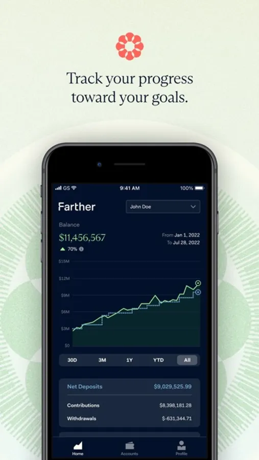 We know how hard it is to sit in the driver’s seat on your financial journey. Our modern interface makes it easier to achieve the visibility you need to maintain control of your finances by offering a holistic view of your financial life. Coupled with powerful advisory tools and access to support when and where you need it most, Farther is designed to be your co-pilot — to help you go farther, faster.