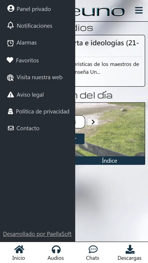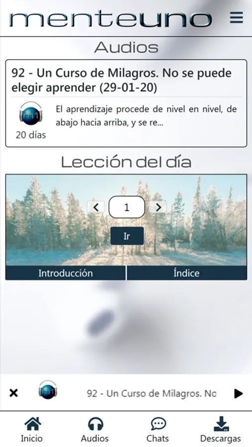 Lección del día con alarma sonora programable y cronómetro cuenta atrás con aviso de finalización del ejercicio, descarga de audios para escuchar en línea o posteriormente sin conexión, lista de audios favoritos y búsqueda por palabras, salas de chat para compartir con otros estudiantes de Mente Uno, notificaciones instantáneas de nuevas publicaciones (audios, artículos, actividades, cursos, nuevo material de estudio, encuentros, avisos, recomendaciones, etc). Acceso en el panel privado a los audios de los grupos online y material de estudio.