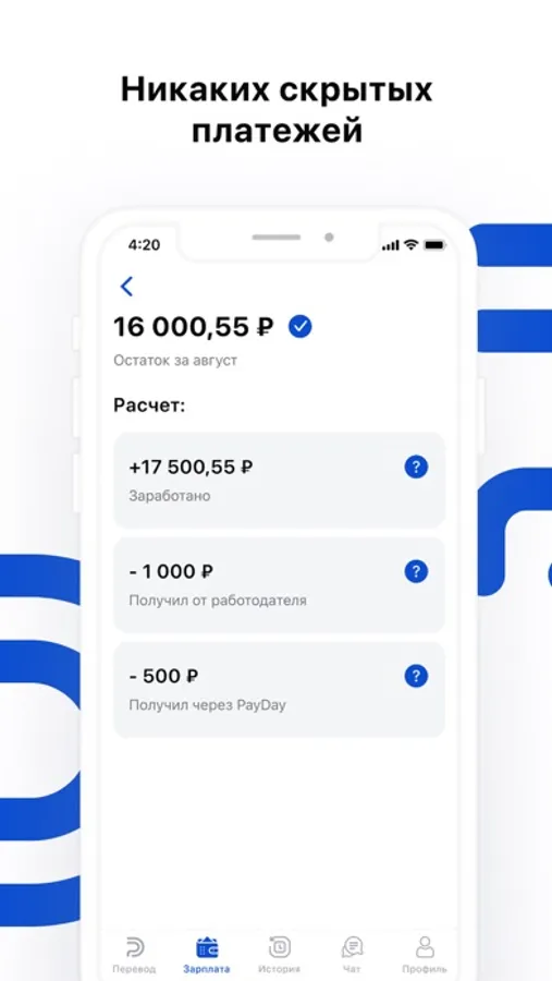 PayDay – это сервис, который позволяет сотрудникам отслеживать количество заработанных денег и получать их в любое удобное время. Наша главная задача - помочь вам управлять заработной платой и справиться с недостатком в деньгах. Ведь заемные средства - все равно чужие, намного лучше взять свои деньги и потратить их с умом.