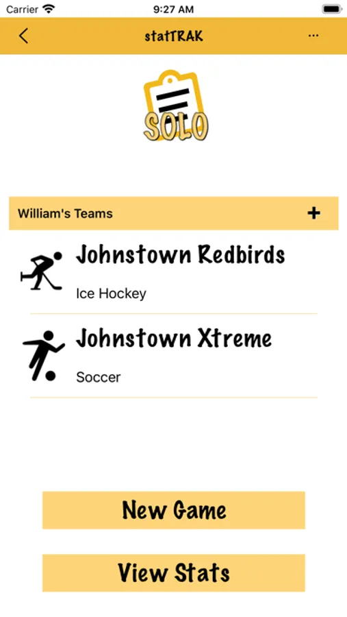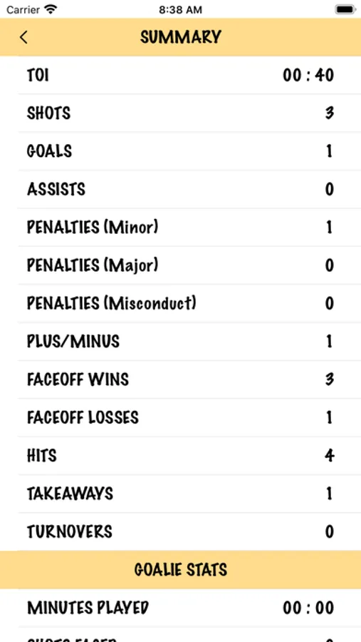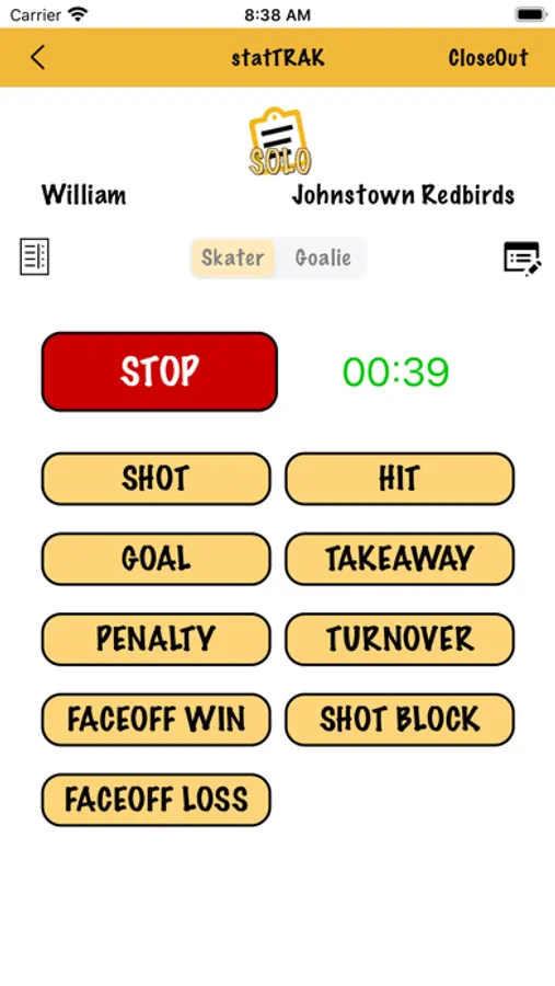 For hockey, with simple taps, you can track the player's ice time and performance. Stats tracked for skaters include: goals, assists, points, +/-, SOG, TOI, PIM, ESG, SHG, PPG, PSG, ENG, ES+, ES-, PP+, PP-, PK+, PK-, hits, takeaways, turnovers, blocked shots, face-off wins and face-off losses. For goalies, SOLO tracks minutes played, saves, goals against, GAA, SV%, wins, losses, ties and No Decisions.