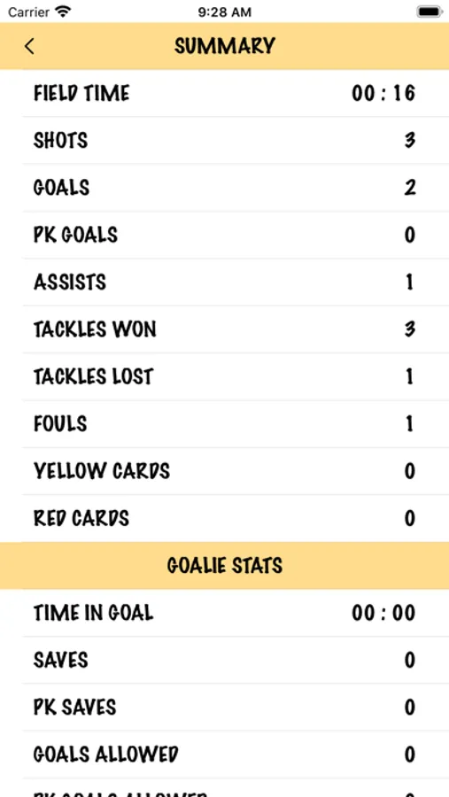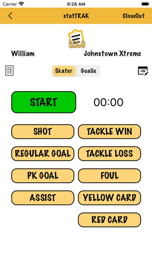 For soccer, with simple taps, you can track the player's game time and performance. Stats tracked for players include: goals scored, both regular and penalty kicks, assists, tackles won and lost, fouls, yellow cards and red cards received. For goalies, SOLO tracks time in net, saves (both regular and penalty kicks), goals against (both regular penalty kick goals), fouls, yellow cards and red cards received.