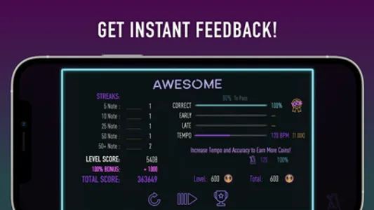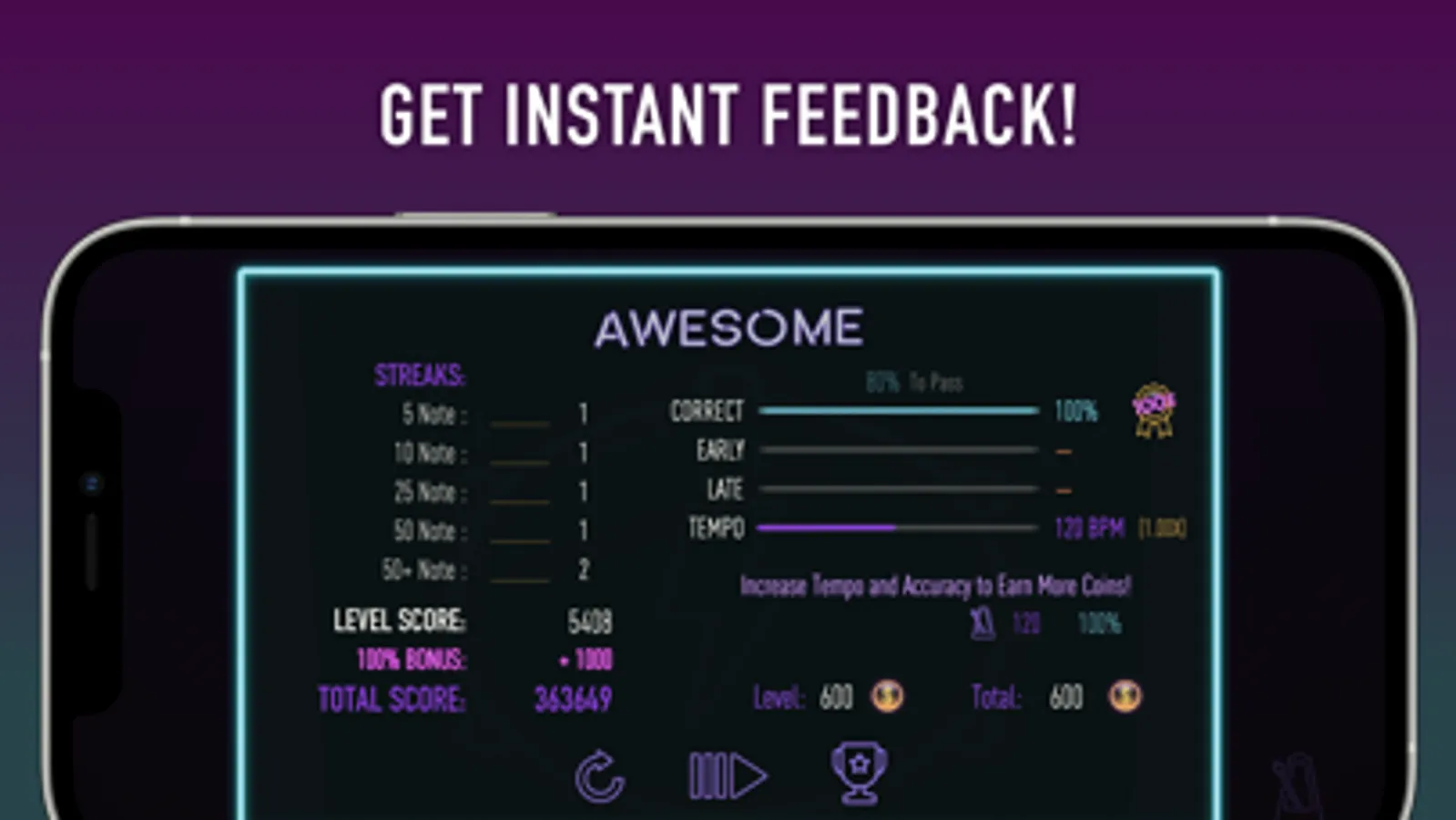 Adjust the tempo of each level to fit your skill level. DrumStudent saves your tempo for each level so you can pick up right where you left off. Beat your previous tempos to score again and again while you make real progress!