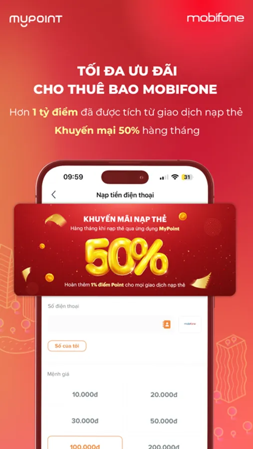 + Ưu đãi tới 50% vào ngày vàng nạp thẻ hàng tháng