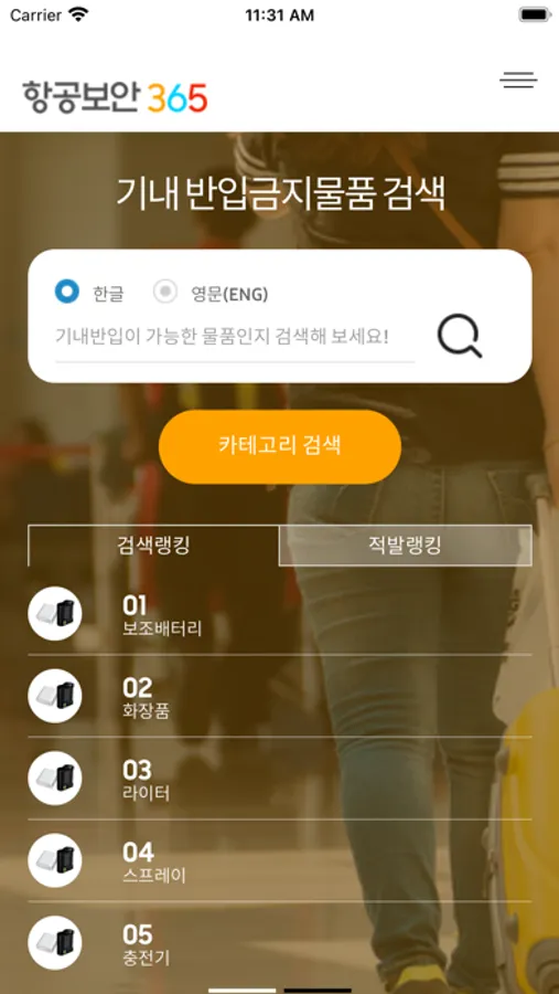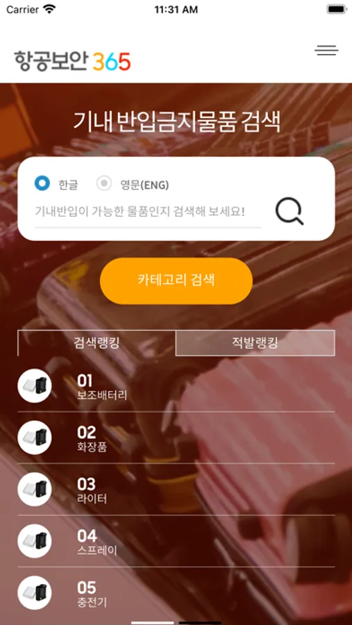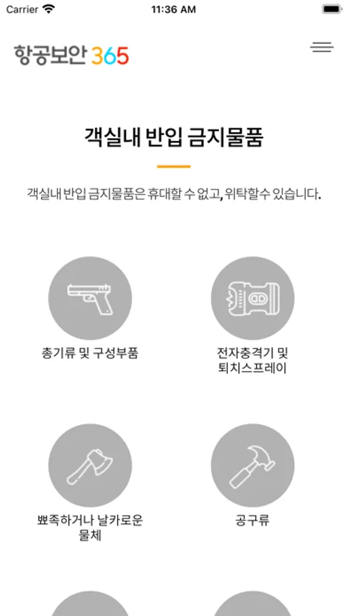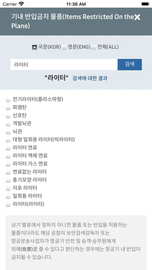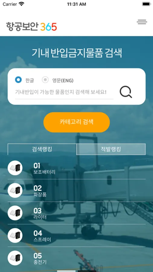 항공기내로 반입이 가능한 물품을 검색 및 확인하는 애플리케이션 입니다.항공기 이용 전 가져가고자 하는 물품이 반입이 가능한지 항공기 이용전 미리 확인하여 주시기 바랍니다.