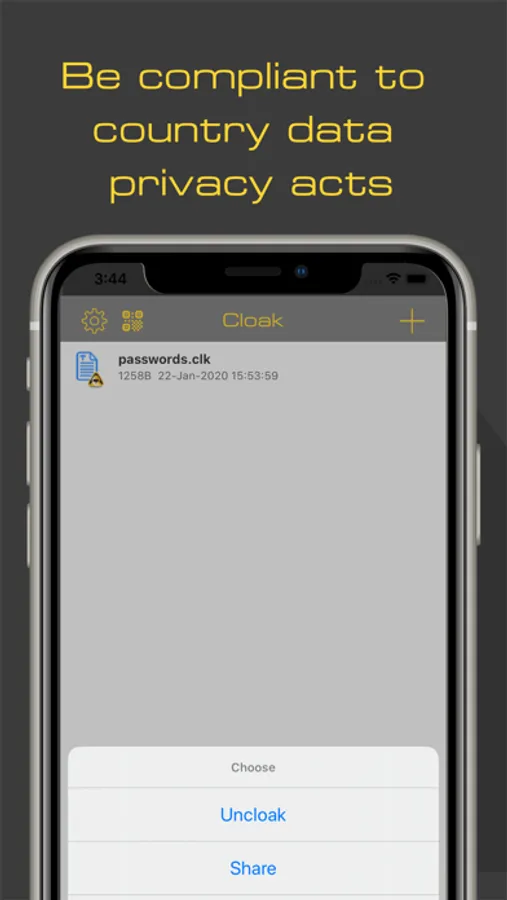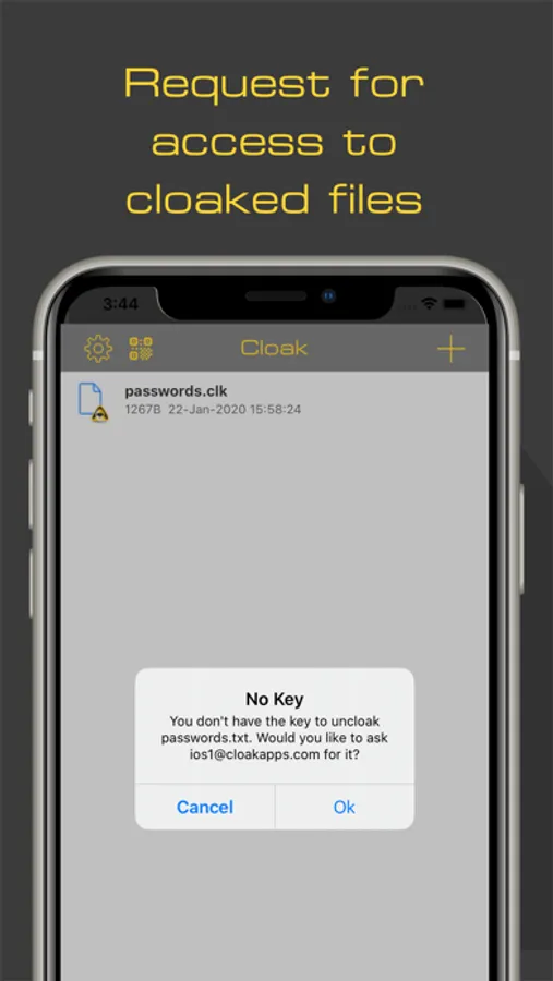 Cloak (encrypt) your files, so that you can safely store or share them on the cloud or via email. Only your authorized recipients will be able to uncloak (decrypt) the files. With our key management services, there are no file passwords to send to recipients.