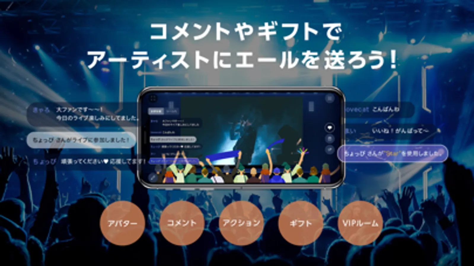 生配信を観ながらコメントやギフトでアーティストの応援ができる機能を搭載し、アーティストとファンがよりインタラクティブにつながれるアプリです。