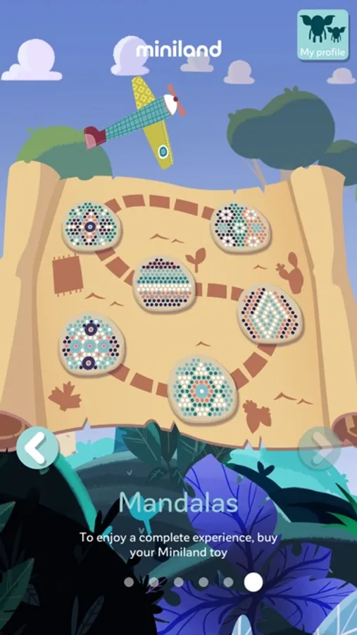 Mandalas for children. In this section they will see a map in which they can fly the plane to get to the countries selected. Once inside they will see the most typical mandala of that country and its music. They can use those images to complete their physical mandalas.