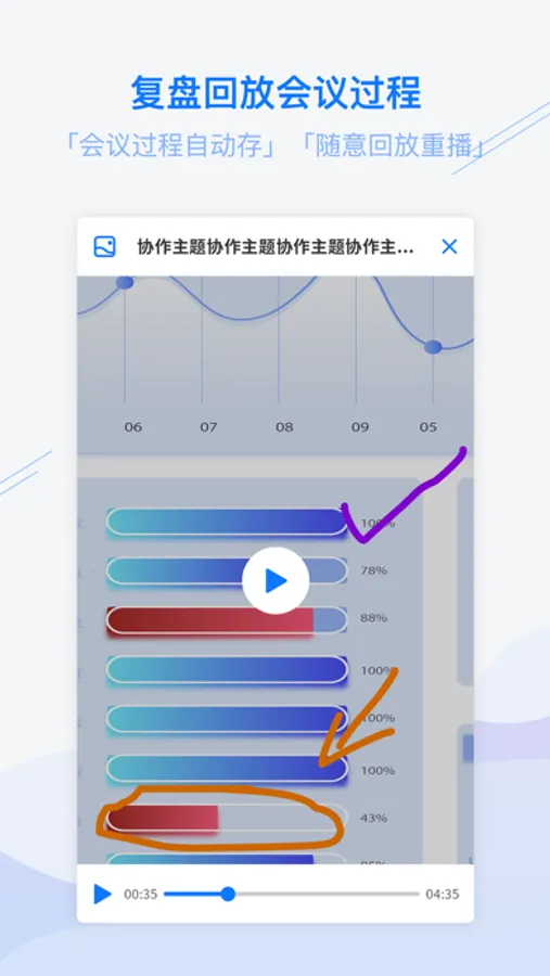 在线会议:可以用大屏或手机加入会议,4人同时连麦在视频的协助下并对文档进行标注协作,支持换麦。其他人也可通过弹幕方式参与会议讨论。会后所有成员可通过重播复盘会议过程避免遗漏重要内容。