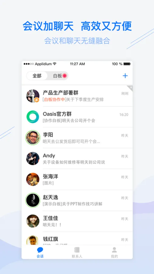 群沟通:通过群沟通和会议深度融合的形式,避免聊天和会议场景割裂的情况。