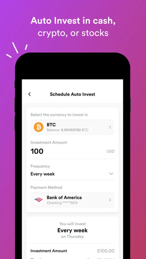 No hidden fees, no complex setups - just simple, seamless bitcoin investing and money management. Plus, our intuitive app makes it easy to track your investments and manage your portfolio on the go.
