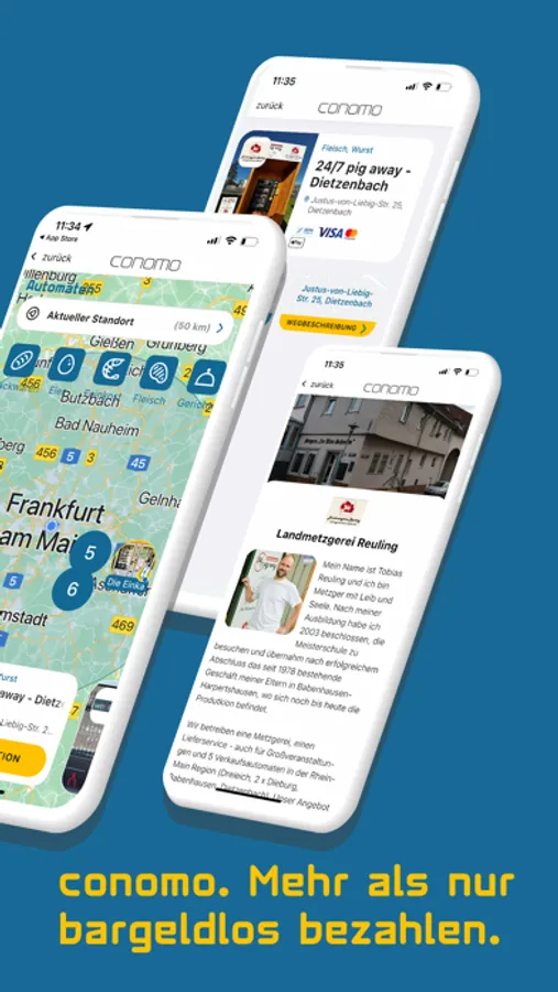 conomo bringt Regionalität und High-Tech unter einen Hut. Ob Snacks, Getränke, Wurst, Kaffee oder Backwaren - über die conomo App findest du immer, was du gerade suchst. Deutschlandweit. Informiere dich über deine Umgebung, die regionalen Erzeuger und deren Produkte oder lasse dich im „Deals“-Bereich von Angeboten oder Rabattaktionen überraschen. Ob Verkaufsautomat, Marktstand, Café, Tante-Emma-Laden oder Verkaufsautomat: Die Bedienung, als auch die Bezahlung, läuft kontaktlos und somit ist die Suche nach passenden Münzen ein für alle Mal vorbei. Pay via App. Überall da, wo früher Bargeld nötig war.