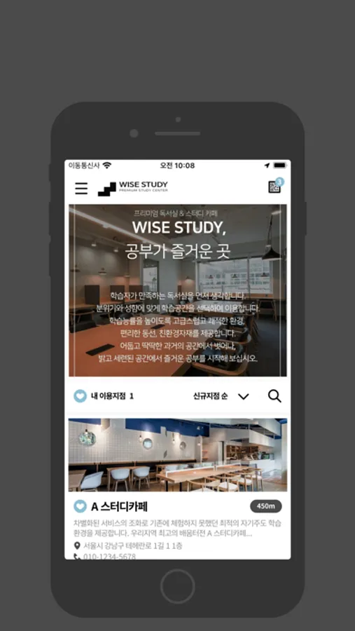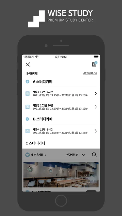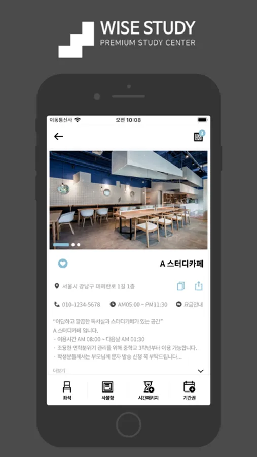 와이즈스터디의 프리미엄독서실과 스터디카페 회원여러분을 위해 만들어진 차별화된 프리미엄서비스 어플리케이션입니다.