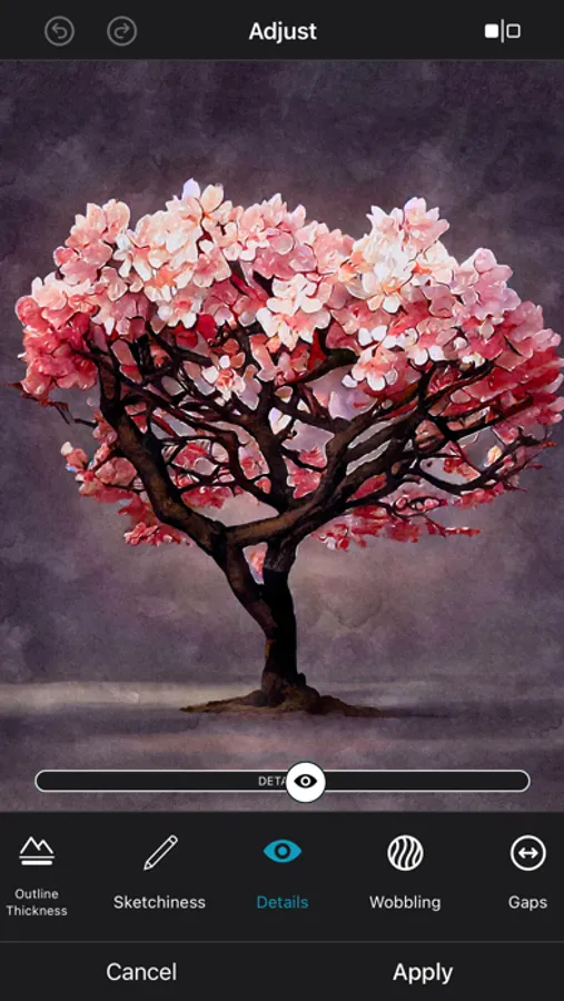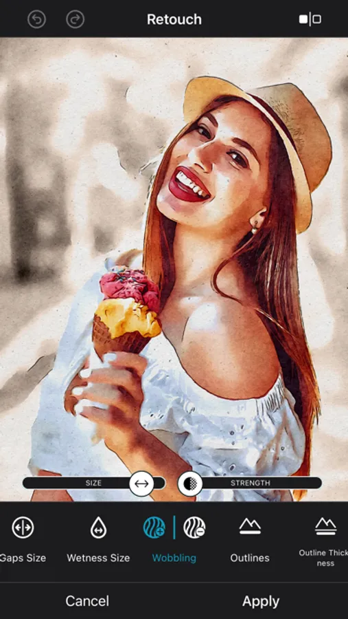 Control the watercolor technology on your own. Decide how your overall artwork should look like by controlling 11 different type of style parameters. Apply more, or less outlines, wetness, wobbling and much more.