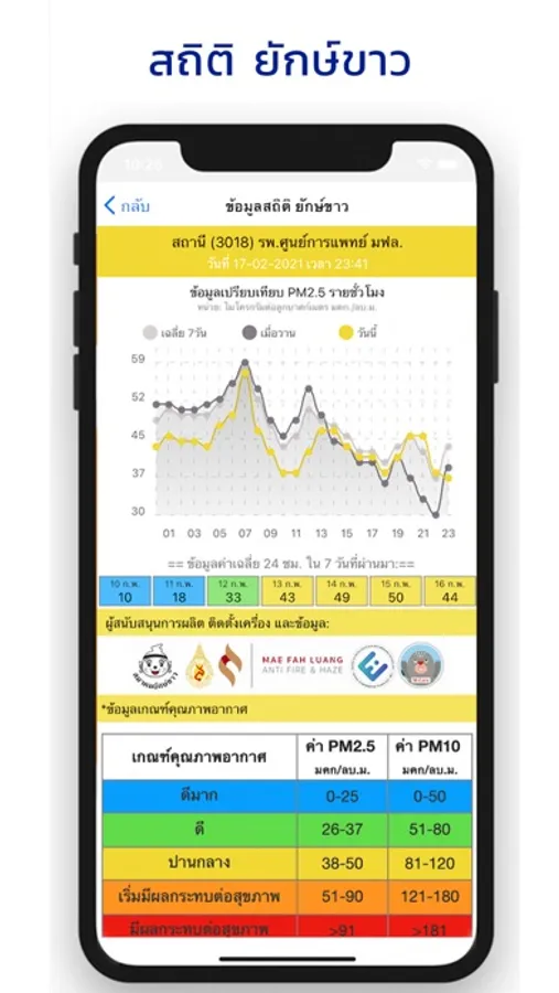 2. ดูค่าฝุ่น PM2.5 เฉลีย 6ชม. 3ชม. 1ชม. และค่าปัจจุบัน พร้อมแสดงแนวโนมค่าฝุ่น
