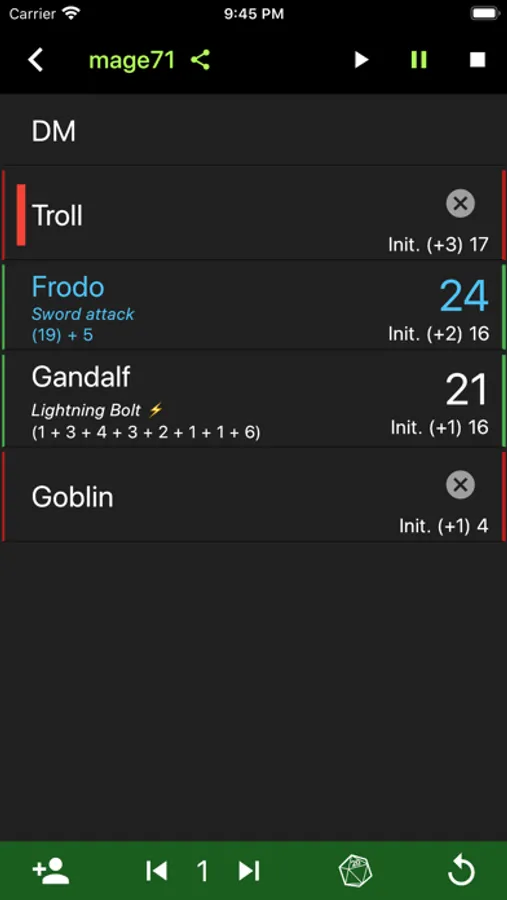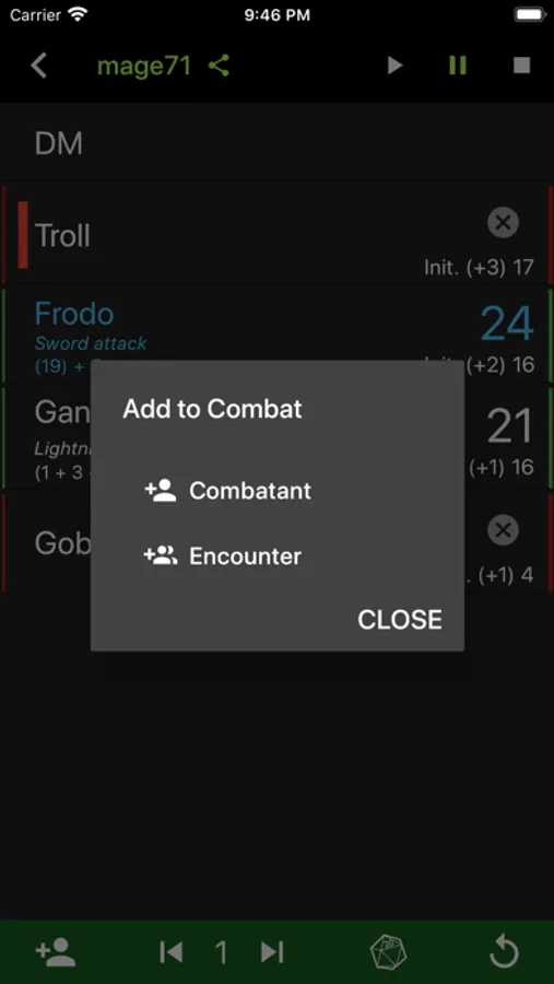 The DM can manage combat initiative. Add and remove monsters. Roll and get combat initiative order for all players and monsters instantly and have it broadcast to each player. The DM can then advance turns. When it is a player's turn, the player can be alerted on their device. During combat, the DM can keep track of monster and player status, like, 'stunned', 'restrained', etc.