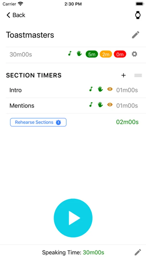 You can set Speaker Presentation Timer and the Pro Speaker Presentation Timer to prompt individual components of your speech and stealthily vibrate in your pocket (or on your watch) as you reach your critical sections.