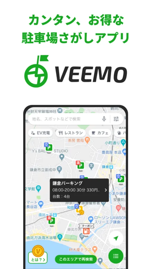 VEEMO(ビーモ)は、条件に合った駐車場を便利にお得に見つけられる駐車場検索アプリです。
