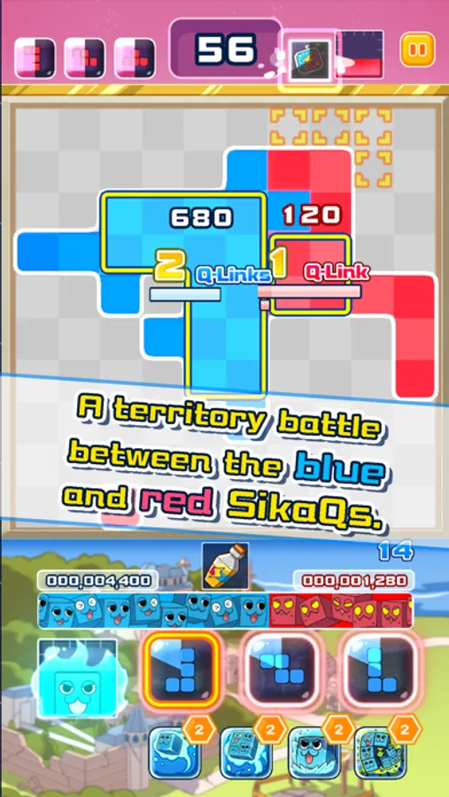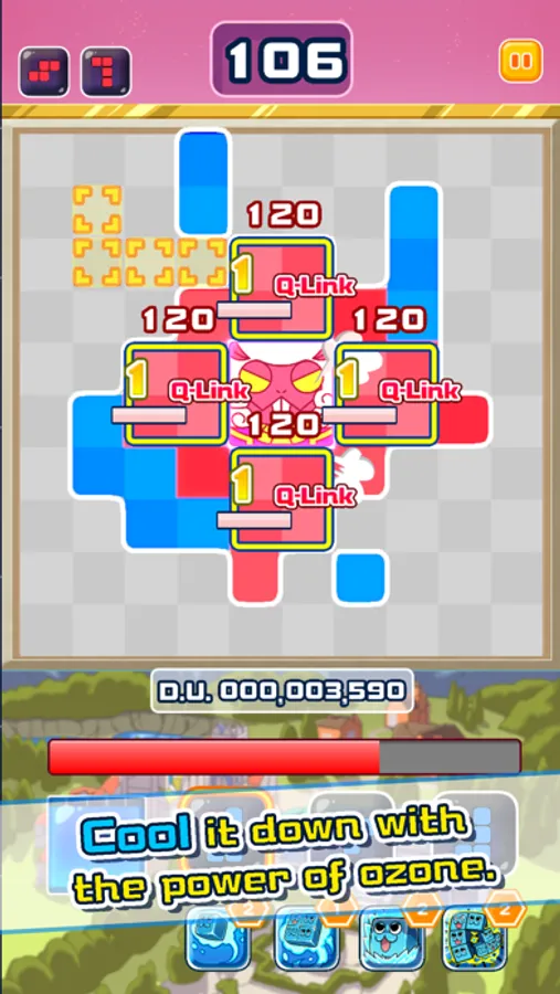 You can build up bigger rectangles to make combos (Q-Links) for even more points and special effects. Your Q-Meter fills as you make rectangles, and when it's full, you can unleash a powerful Q-Skill! Q-Skills are special moves that can instantly clean up red spaces and ozone holes in an area.