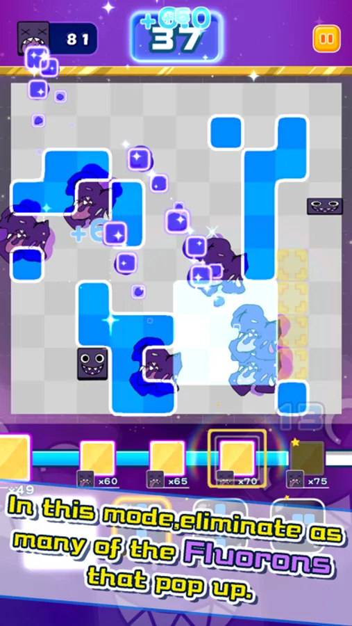 In this mode, the goal is to eliminate as many of the Fluorons that pop up on the screen as you can before time is up. The more you get rid of, the more items you'll earn! Which items you get depends on the area. There are certain special items and characters you can only get in this mode, so take out those Fluorons!