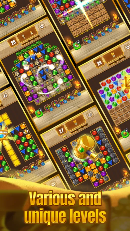 Each of the 100s of puzzle levels has unique and creative obstacles to overcome on your quest to become the best jewel crush explorer in Egypt. Switch jewels, swap gems, and blast away blocks to uncover the secret of the Sphinx and walk away with the treasure of Cleopatra.