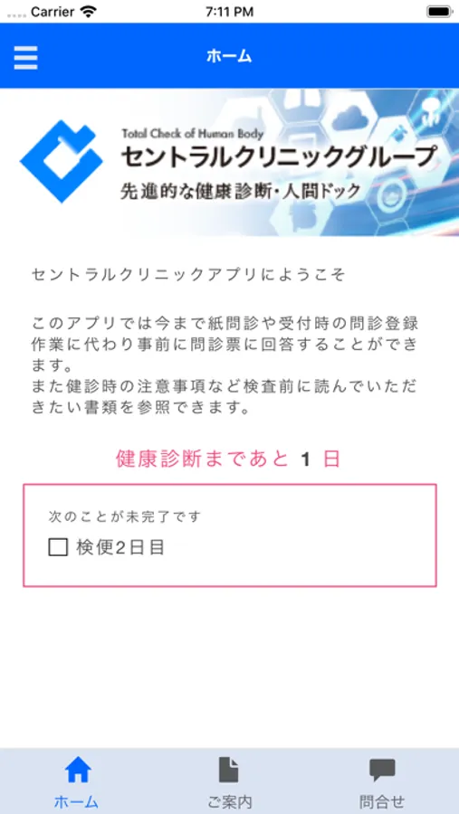 アプリを開いたら、健康診断の事前案内用紙にある「アプリのはじめ方」に従ってアプリを操作してください。
