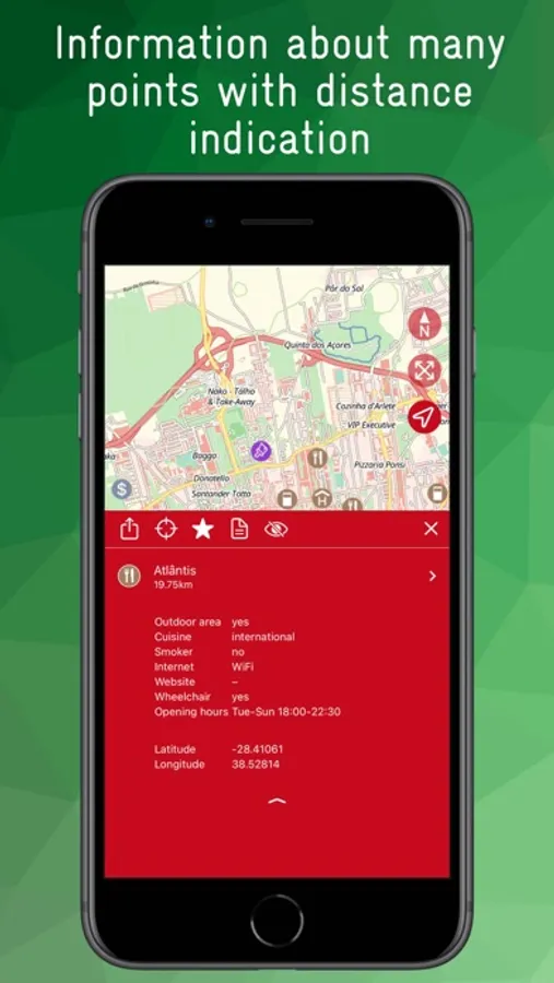 For many POIs there is further information such as opening hours, address, disabled access, ... Notes or favourites can be created for each POI, a history list shows the most recently used POIs, content can be shared.