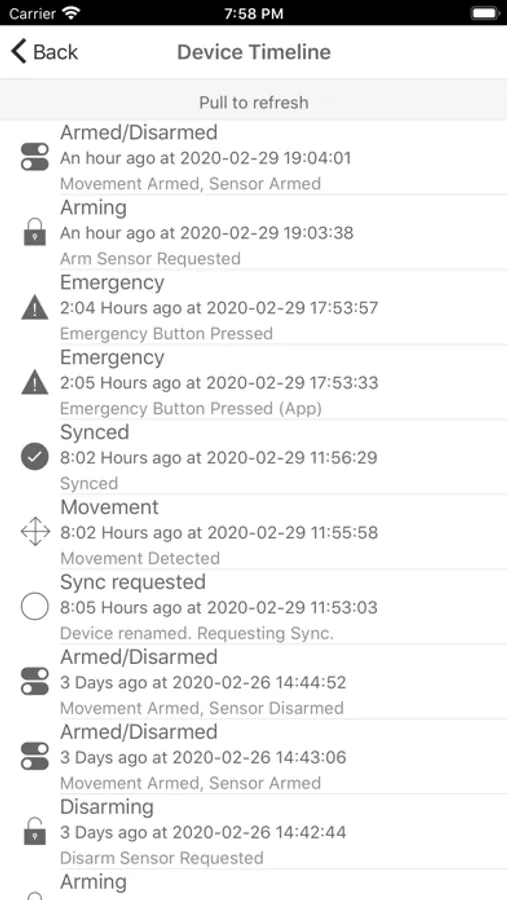 Power off, Battery low, Power on, Movement, Sensor, Panic