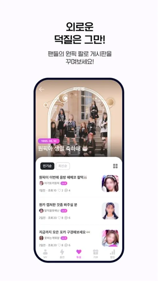 투표만으로 내 최애 아이돌, 트로트 스타를 무료 광고하고 팬덤과 소통해보세요.