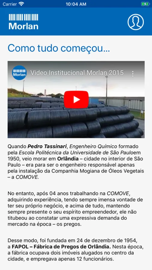 Você sabia que a Morlan já se chamou FAPOL, ou que nos primeiros anos de sua existência ela era uma fábrica de pregos? Saiba um pouco mais sobre a história da empresa na área Institucional do aplicativo.