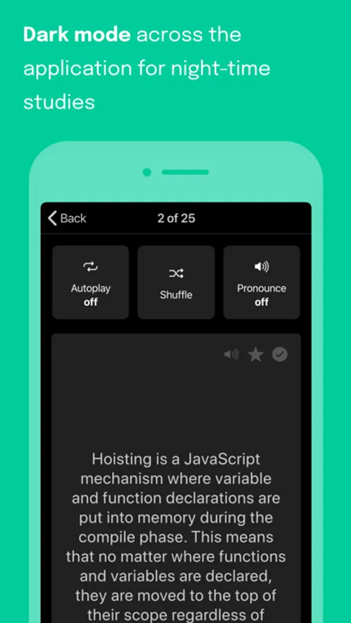 Pronunciation using the operating system's built-in voices (the number of languages may vary between devices and operating system versions, pronunciation can be enabled by setting the term's and definition's language in the study set settings)
