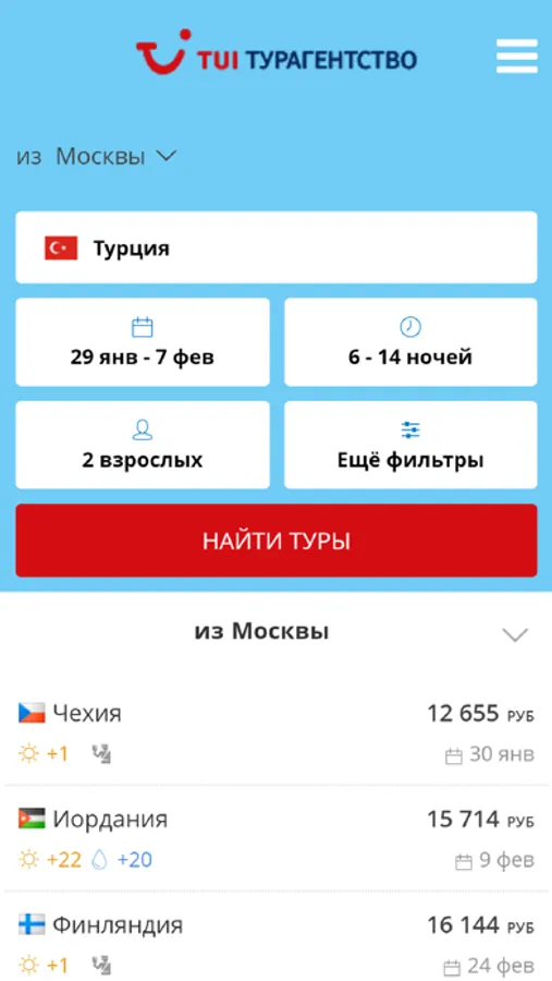 Официальное приложение TUI Турагентства позволяет найти выгодные цены на горящие туры, а также предоставляет удобный поиск туров онлайн. Это бесплатный сервис для всех желающих подобрать и забронировать тур прямо со своего мобильного телефона.