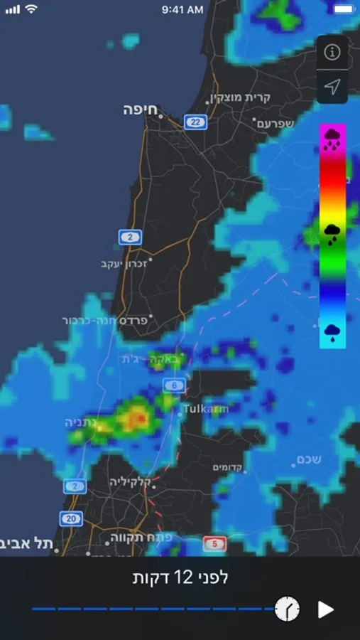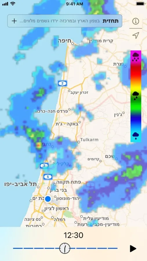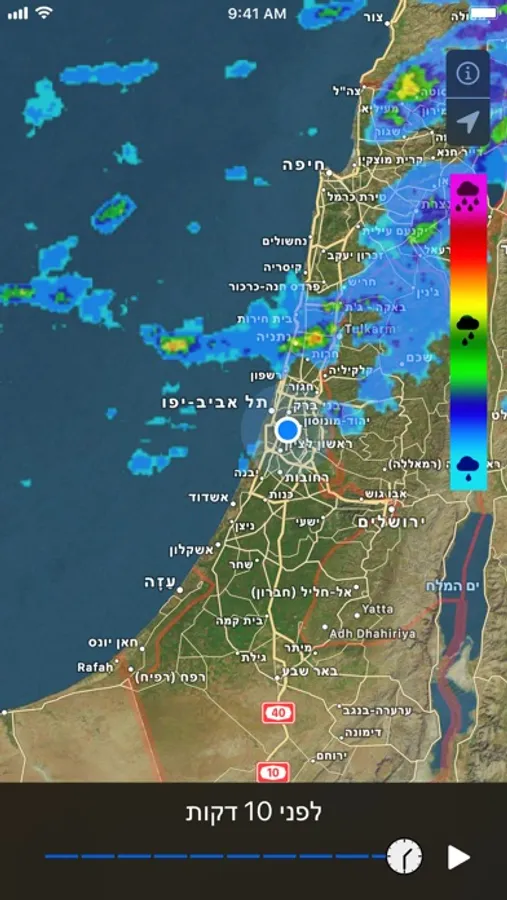 • נוחות: הצגת מיקומך הנוכחי וענני הגשם במסך מלא, על גבי מפה אינטראקטיבית: ניתן להזיז את המפה, להגדיל, להקטין ולסובב