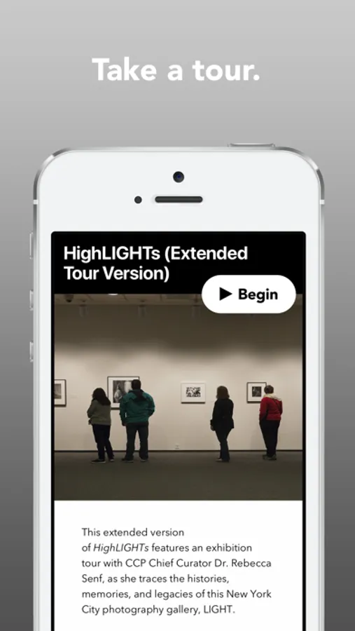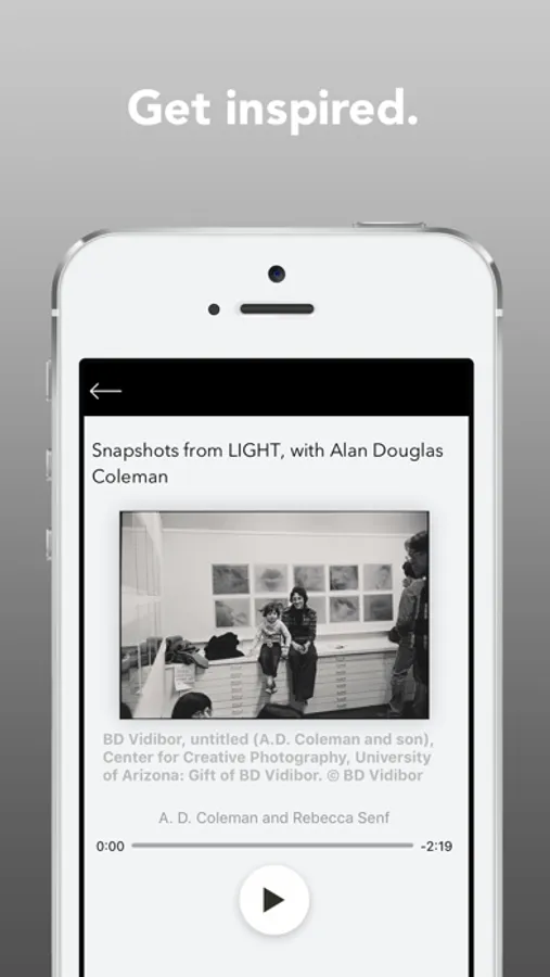 CCP Interactive expands the possibilities of engagement with the Center for Creative Photography's (CCP) exhibitions, art and archival collections, and programs. Find guided tours of CCP galleries; selections from photographic and oral history collections; A/V content and hyperlinks for suggested further learning; and information about institutional membership and other upcoming events. The CCP Interactive App is made possible by a generous contribution from Max McClausin and powered by Cuseum. This app will make use of your GPS which can cause a decrease in battery life.