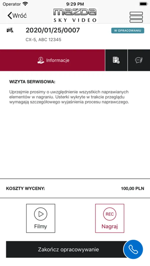 MAZDA Sky Video to aplikacja pozwalająca usprawnić prace autoryzowanego serwisu samochodowego. Obsługa serwisu może utworzyć nagranie video, które finalnie zostanie przekazane do Kliena.