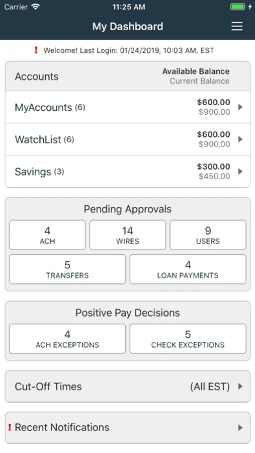 TOP displays accounts, balances, pending approvals, ACH and Check Exceptions, quick deposit, batch deposit, cutoff times and recent notifications.