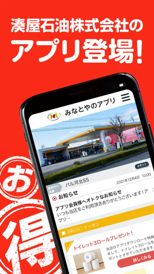 お客様おカーライフに快適をご提供するため、湊屋石油株式会社のアプリ「みなとやのアプリ」を通じてさまざまなサービスを提供いたします。