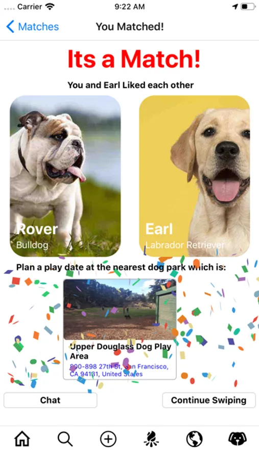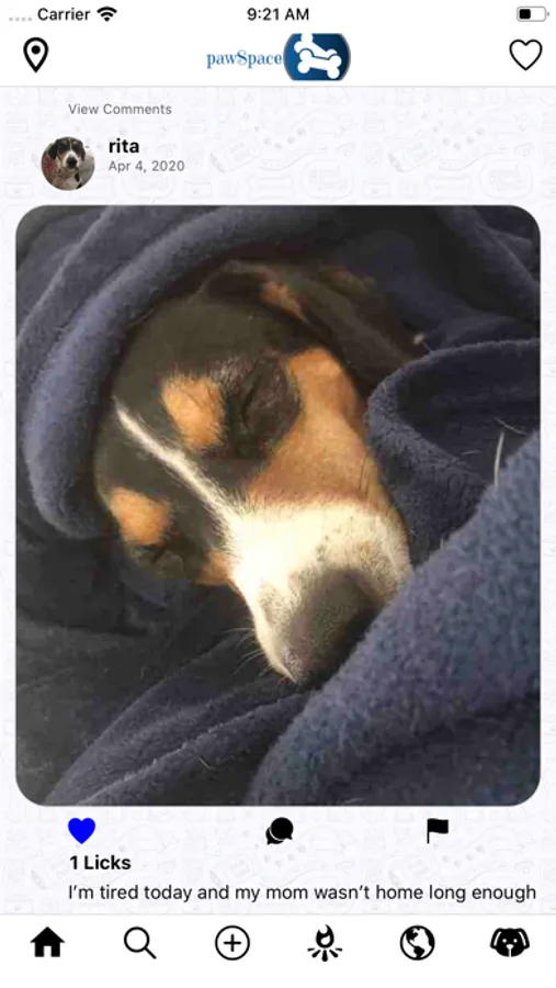 pawSpace is an app that allows users to post their dogs and share content about them including their name, breed, gender and an individual story about their dog. The app will be a a mix between instagram and facebook but purely for dogs. The user will be encapsulated from the dogs and no information about the user will be posted, instead each user will have the capability to have multiple dog profiles where each dog will be identified by a unique identifier known as a "dogTag" instead of a username. Users will have the abilities to follow other dogs like their pictures and posts using a feature known as a "lick" instead of liking and have the ability to message and greet with other dog owners. Users will have multiple tabs, the first being a home screen which will first be populated with the profile of a dog that wants to be adopted in your area based on your current zip code, you will also see local dog parks and essentials dog services in your area such as pet stores, vets and local dog groomers.The user will also have a tab to view other dogs in the area and decide whether they like or dislike that dog and if both dogs like each other they will match and will be able to setup a play date(a tinder like system). The next tab will be a map of the world where the user can click in any major city and see all the dogs and their posts from that city. The last tab will be of the dog profile itself which will feature the dog name, the dogTag, breed, gender, age, bio and other information about the dog.